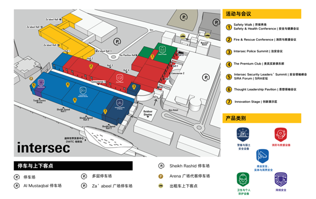 本屆迪拜勞保展包含五大展區:商業安全、實體與周界安全展區,警備與國土安全設備展區,網絡安全展區,衛生與個人防護設備展區以及消防與救援設備展區。